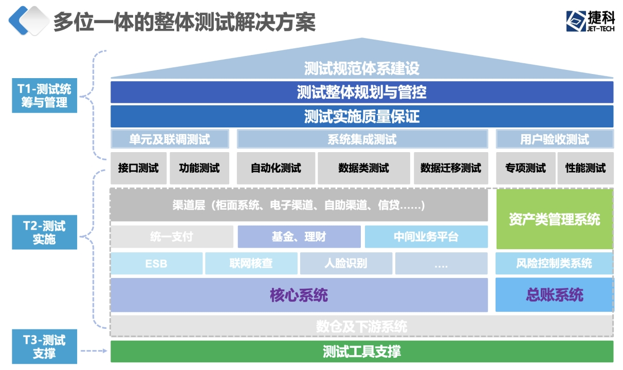 捷科是一家專業的金融測試服務與整體測試解決方案供應商,提供集咨詢、研討、實施,培訓等一體化服務。專注于新一代核心系統群建設項目的測試解決方案,擁有業界最強大的專家團隊,最豐富的實施經驗,最先進的管理理念,精于大型項目測試統籌規劃、實施過程精細化管控、風險精準識別與控制。