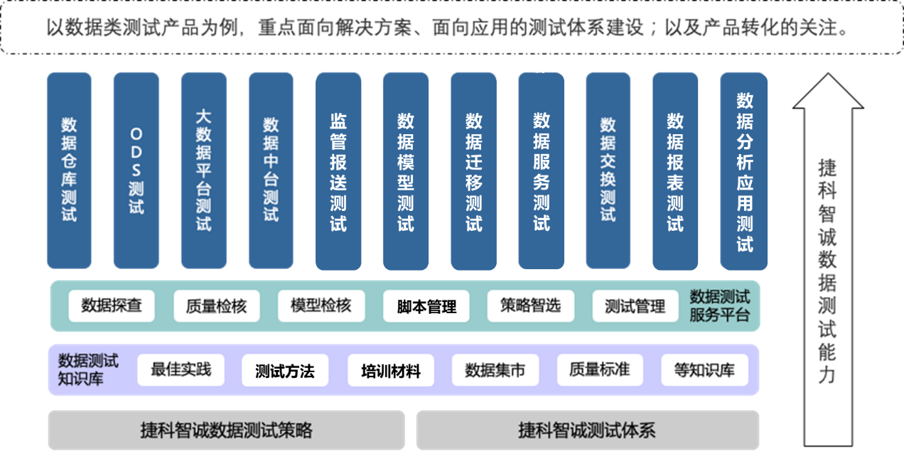 捷科從2010年開始從事報表類數(shù)據(jù)類系統(tǒng)的測試,通過規(guī)范化的測試能力,積累了豐富的行業(yè)經(jīng)驗。2017年發(fā)力于專業(yè)化數(shù)據(jù)測試細分領域,在吸收了業(yè)內(nèi)對于數(shù)據(jù)倉庫、數(shù)據(jù)報表、數(shù)據(jù)遷移等多方面先進測試經(jīng)驗的前提下,組建了專業(yè)化數(shù)據(jù)實施部門,同時不斷總結和優(yōu)化數(shù)據(jù)類測試解決方案,為眾多客戶提供了有效的質(zhì)量保障。通過對數(shù)據(jù)類系統(tǒng)的細分,通過對數(shù)據(jù)類系統(tǒng)的接口、數(shù)據(jù)、邏輯、性能、非功能等驗證點進行充分分析,搭建了具有業(yè)務能力、技術能力、數(shù)據(jù)分析能力、開發(fā)能力的測試實施團隊,搭配有效的測試解決方案,能夠為客戶提供高質(zhì)量的測試質(zhì)量保障能力。