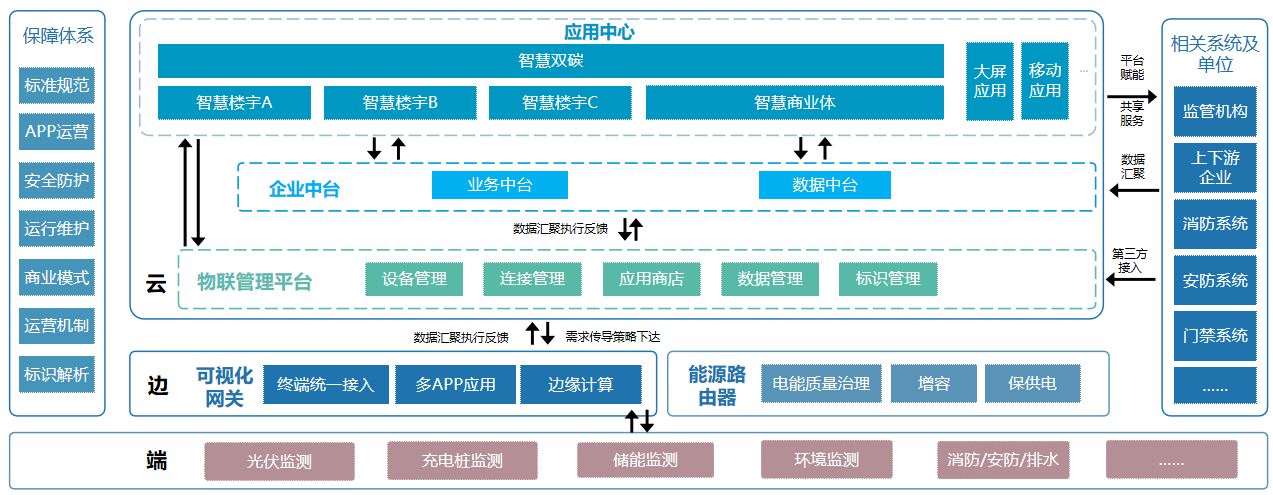 智慧雙碳園區平臺通過實現雙碳分析、微網監控、樓宇智能化監控、充電樁監測等,為園區運營單位提供綠色辦公、舒適用能、節約用能的策略建議。系統整體架構分為三層結構,其中云側包括物聯管理平臺、企業中臺及應用中心三部分;邊側包括可視化網關軟硬件、雙碳能源控制器軟硬件;端側為各類傳感裝置、攝像頭等采集設備。