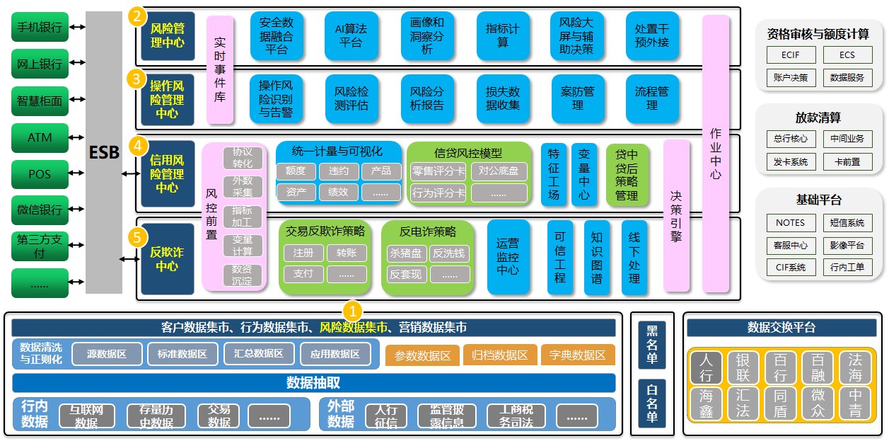 為銀行建設全行級風控中臺系統,包括五個核心部分:風險數據集市、風險管理中心、操作風險管理中心、信用風險管理中心和反欺詐中心。
