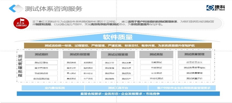 制度體系文檔構(gòu)建,包含測(cè)試工作機(jī)制;項(xiàng)目管理辦法;規(guī)程文件,包括各領(lǐng)域過(guò)程應(yīng)遵循的基本原則、過(guò)程的執(zhí)行要求、度量和裁適等;指南、模板、檢查表和樣例等。通過(guò)項(xiàng)目試點(diǎn)、持續(xù)改進(jìn)及推廣,逐步完善體系內(nèi)容。規(guī)劃組織架構(gòu),根據(jù)客戶(hù)業(yè)務(wù)發(fā)展和戰(zhàn)略定位,結(jié)合現(xiàn)狀及業(yè)內(nèi)最佳實(shí)踐進(jìn)行測(cè)試處室組織架構(gòu)及人員規(guī)劃,清晰崗位職責(zé)、保障測(cè)試工作有序開(kāi)展,為人員管理提供依據(jù)。測(cè)試工具體系建設(shè),合理、必要的專(zhuān)業(yè)測(cè)試工具的引入與...